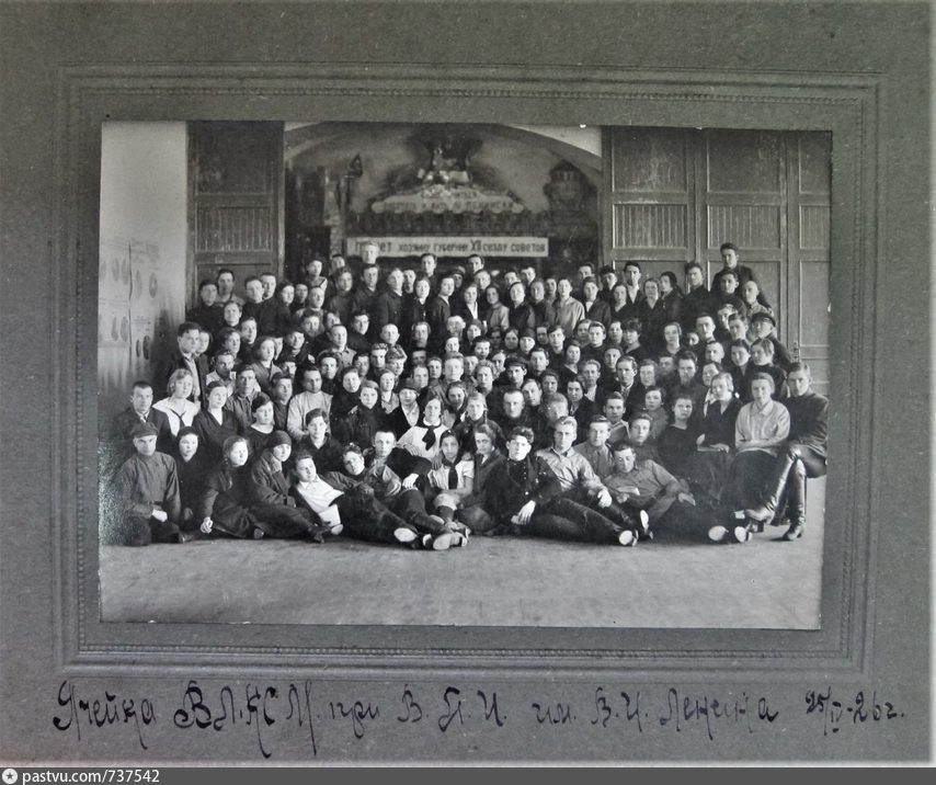 Ячейка ВЛКСМ при ВПИ им. В.И. Ленина. ВПИ - Вятский педагогический институт. По всей видимости это бывшая домовая церковь епархиального женского училища. Иконостас убран, а бывший алтарь превращен в красный уголок. Видны лозунги: "Учиться, работать и жить по-ленински", "Привет хозяину губернии ХII съезду советов".